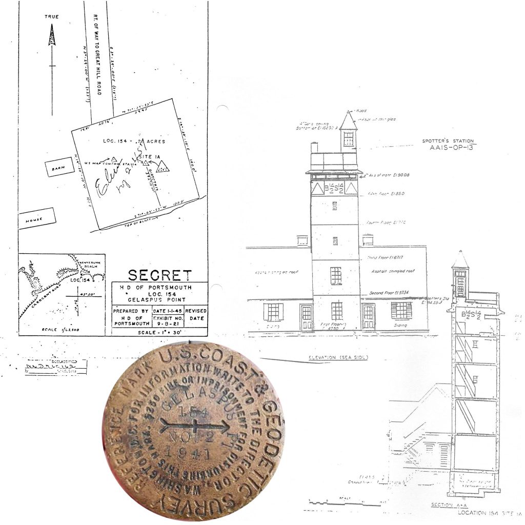 Construction of the new Location 154 Base-End Station at Great Hill in Kennebunk was completed by the Army on a leased lot in 1943 for $16,514.00. It was a five-story square reinforced concrete tower with a false steeple on top. According to ‘New England Defenses’, “a wooden cottage surrounded the first two stories of the tower to aid in camouflage and provide barracks for the crew manning the tower. The reinforced concrete walls were 10″ thick and were splinter proof.”