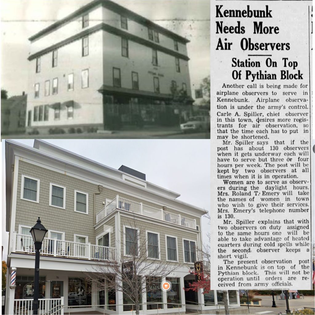 While Location 154 was still being constructed, Civilian Defense Volunteers watched for planes from atop the Pythian Block on Main St in Kennebunk. Local Newspaper reporters were cryptic when describing the location of the new plane spotting facilities in case the enemy was secretly subscribed. The editor for one newspaper wrote that it was being “erected on our biggest hill.”