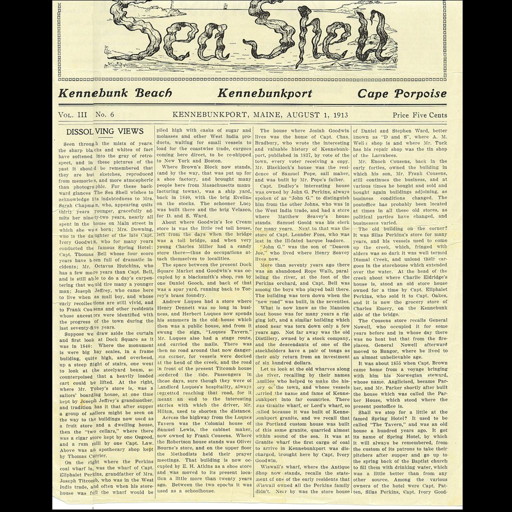 In preparation for my Dock Square slideshow coming up at the Townhouse School next Thursday evening, I am sharing part of one of the Dock Square history sources I used for the research. “Dissolving Views” was an article printed in the August 1,1913 issue of the Kennebunkport summer newspaper, Sea Shell. The Editor interviewed older Kennebunkport residents who still remembered how Dock Square looked in the 1840s.