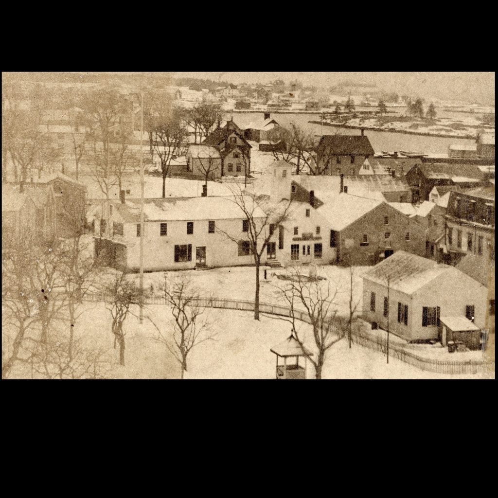 The lot where Colonial Pharmacy now stands was Eliphalet Perkins’ shipyard. The brig Eveline was on the stocks there in 1840. Shipbuilder brothers, Daniel and Stephen Ward launched their first vessel, sch Nile, out of the Dock Square shipyard in 1841. The sch Lucy and the brig Velasco were both launched from Dock Square in 1845 for D. and S. Ward.