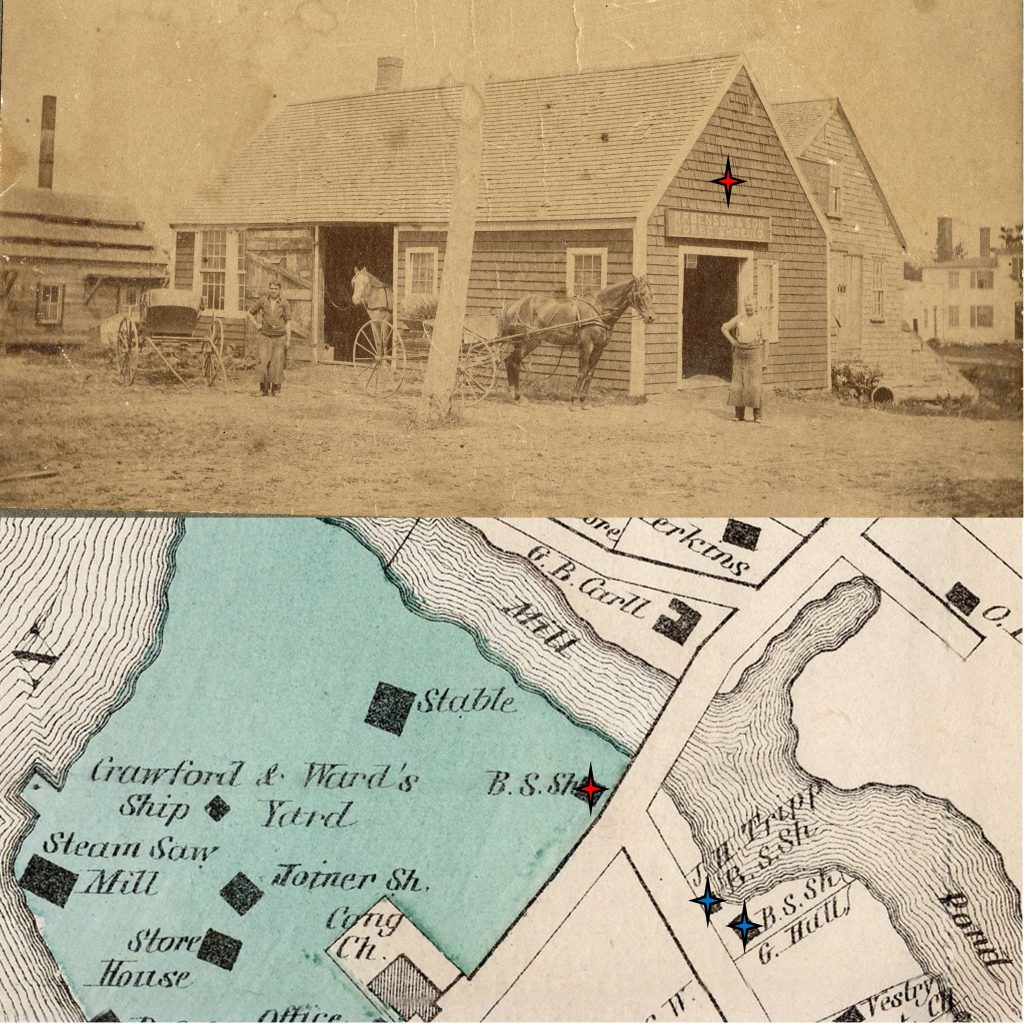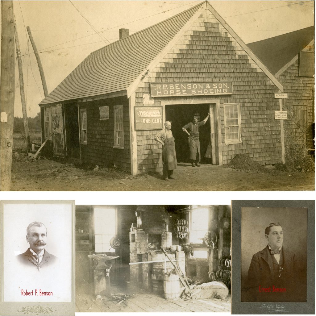 There were plenty of blacksmiths working in Kennebunkport Village. Three of them are indicated on the 1872 map of Kennebunkport right at the junction of North St, Maine Street and Temple Street; Mr. Hall, Mr. Tripp, and one unnamed blacksmith shop that would come to house the Robert P. Benson horse shoeing business starting in 1884. Robert’s son Ernest joined him in the business ten years later. They worked together shoeing horses until Robert’s death in 1919. Ernest carried on at the same location until the Masonic Lodge was under construction, at which point he moved to a smaller shop on Oak Street.