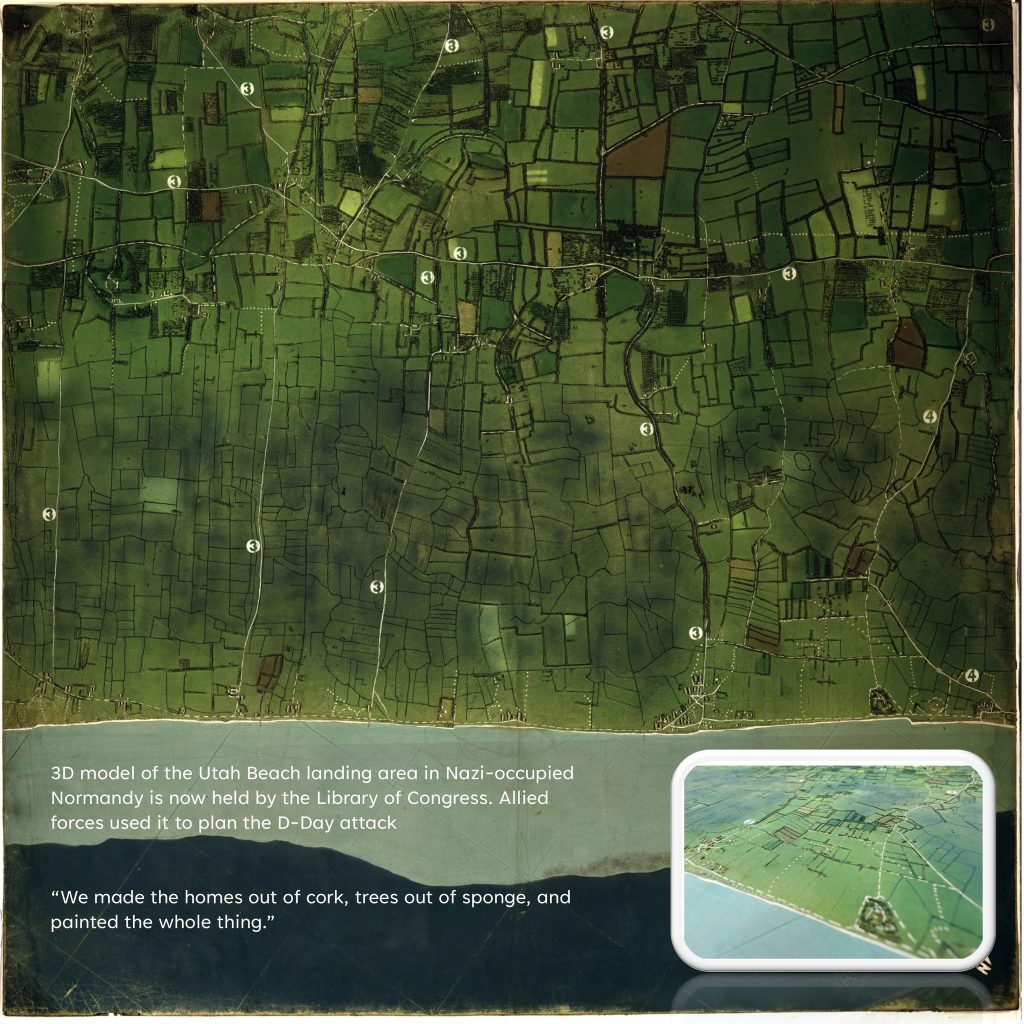 Peter Carl Hesse was a 22-year-old Providence Rhode Island man. His mother’s grandfather was famous Kennebunk shipbuilder, Nathaniel Lord Thompson. Peter attended Rhode Island School of Design for a year before World War II intervened. He used his artistic talent during the war as part of a top-secret unit creating a 3D model of the Utah Beach landing area in Nazi-occupied Normandy. Allied forces used it to plan the D-Day attack. Many years later Peter explained in an interview, “We made the homes out of cork, trees out of sponge, and painted the whole thing.” The 3D map they made is now held at the Library of Congress.