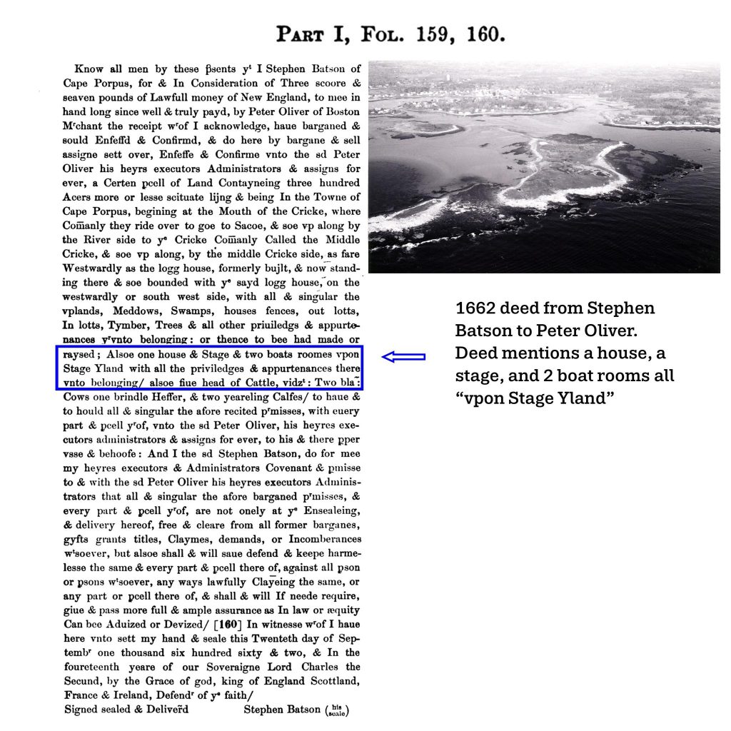 The deed from Batson to Oliver also included a house, a stage, and 2 boat rooms all “upon Stage Island.” Historian Charles Bradbury identified Stage Island as the part of town first occupied by European fishermen before 1630.