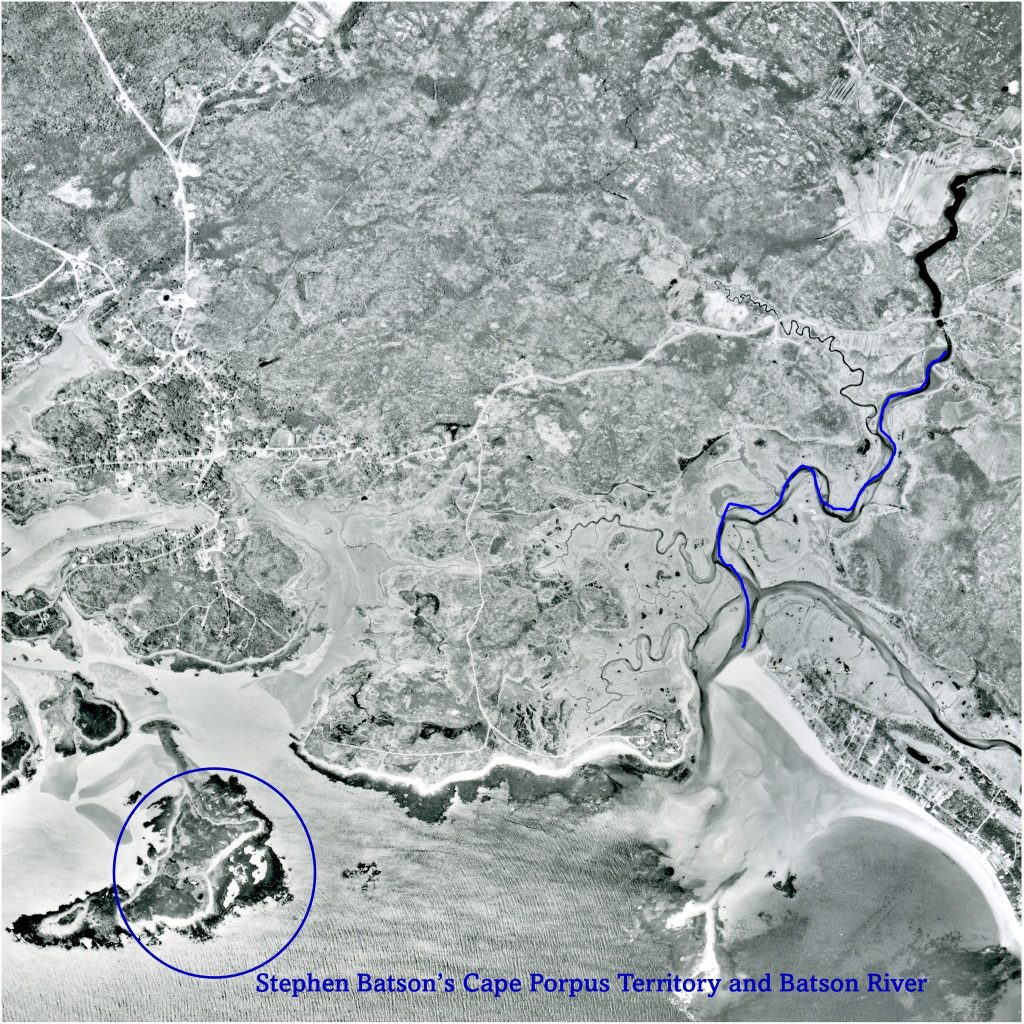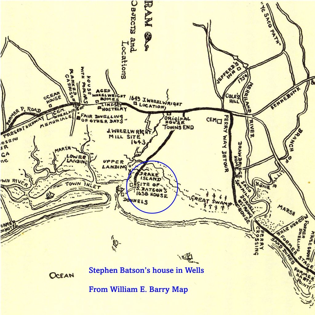 Stephen Batson, for whom Batson River is named, lived in Saco in 1637. He was living at Drake’s Island in Wells by 1641. Batson witnessed the Wadleigh Indian Deed to Wells in October 1649. John Wadleigh obtained a quitclaim from sagamore Thomas Chabinocke and his mother, Ramanascho, of all the territory within the bounds of Thomas Gorges’ grant to Wheelwright and others.