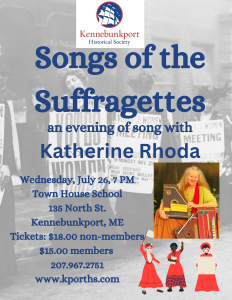 Inspired by programming at the Parsonsfield-Porter Historical Society on the 100th anniversary of Maine’s ratification of the 19th Amendment, Katherine Rhoda has been working on historical songs of women’s suffrage.