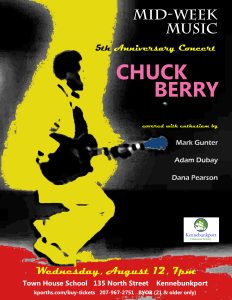 Hail! Hail! Rock and roll! To mark Mid-Week Music’s fifth anniversary, host Dana Pearson (guitar) teams up with frequent collaborator Mark Gunter (keyboard) and new guest Adam Dubay (drums) to unleash an avalanche of vintage rock and roll, courtesy of Founding Father Chuck Berry. You know ‘em, you love ‘em: “Sweet Little Sixteen,” “Roll Over Beethoven,” “No Particular Place to Go,” “Promised Land,” “Johnny B. Goode,” “You Never Can Tell,” etc. Saxophonist Mary Kennedy will sit in on a few of the numbers.