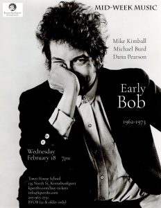 Guitarist/singer Mike Kimball and bassist Michael Burd (who has played bass for Dave Mallett and Noel Stookey) join host Dana Pearson (vocal, guitar, harmonica) in covering Bob Dylan’s first decade of recording, including “Masters of War,” “Lay Lady Lay,” and “Song to Woody.” This is Kimball’s and Burd’s first time on the Mid-Week Music stage.