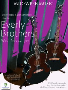Phil and Don Everly harmonized on so many memorable tunes in the 1950s and ’60, beginning with their 1957 debut single “Bye Bye Love.” Plenty more hits followed, including “Wake Up Little Susie,” “When Will I Be Loved,” and “Love Hurts.” Tonight, singer-guitarist Byon Yeatts of Kennebunk and host Dana Pearson (vocal, guitar) play a couple dozen of the Everlys classics.