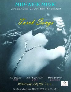 Chanteuse Aja Bowley makes her Mid-Week Music debut, along with pianist Mike Effenberger, with this concert of classic torch songs recorded by the likes of Julie London (“Cry Me a River”), Ella Fitzgerald (“Someone to Watch Over Me”), Etta James (“I’d Rather Go Blind”), and Billie Holiday (“Come Rain or Come Shine”). Host Dana Pearson will provide percussion while mostly enjoying the show.