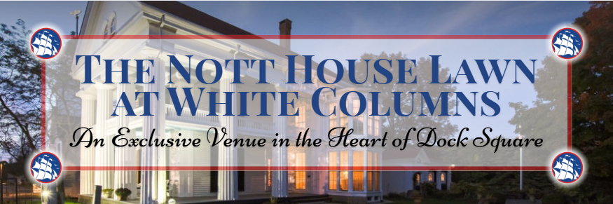 Nestled beside the river and adjacent to picturesque Mast Cove, the Nott House Lawn offers an unforgettable setting for your special event. Framed by historic gardens and a classic stone patio, this beautifully maintained property is just a short stroll from Dock Square and only 1/8 mile from public parking.